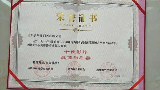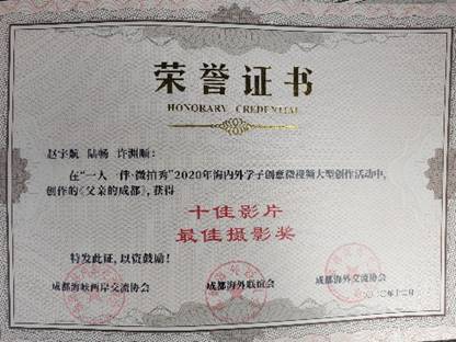 近日,由我院教师刘晨晖带领学生王乐乐、赵宇航、陆畅等七位同学拍摄的创意微视频《小美带你看成都》和《父亲的成都》分别获得2020年海内学子创意微视频大型创作活动“最佳影片奖”和“最佳摄影奖”。
