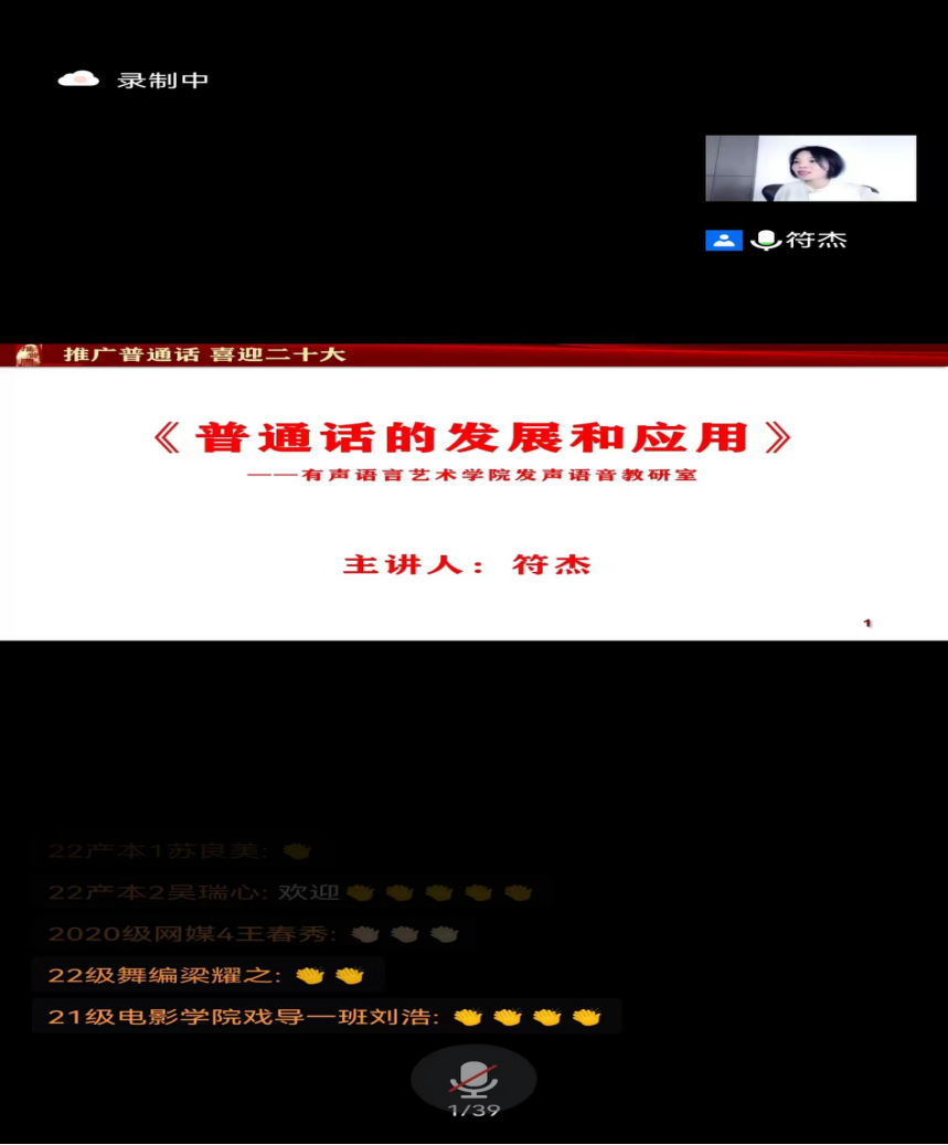 为进一步推广和规范使用国家通用语言文字,9月15日下午,我校通过腾讯会议举行第25届全国普通话推广宣传周专场活动,我院语音发声教研室教师符杰副教授为数百名师生做题为“‘声音力量·话里中国’普通话的发展与应用”的专题讲座。著名朗诵艺术家、国家级普通话测试员、我院副院长张北丽教授为讲座致辞,教务办公室主任万艳老师主持讲座。