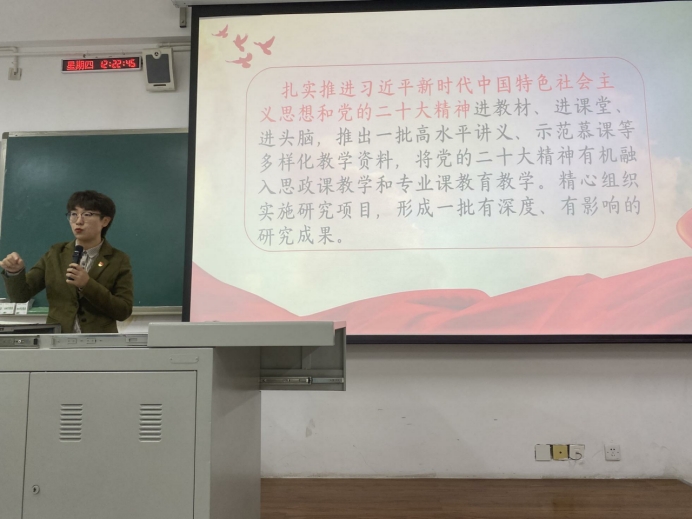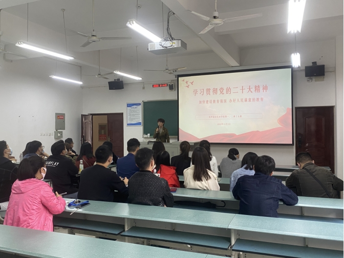 在主题讲话中,万书记先带领大家重温了习近平总书记代表第十九届中央委员会向党的二十大作的报告。她介绍:党的二十大是一次高举旗帜、凝聚力量、团结奋进的大会,大会作出的各项决策部署、取得的各项成果,必将对全面建成社会主义现代化强国、全面推进中华民族伟大复兴,对夺取中国特色社会主义新胜利发挥十分重要的指导和保证作用。着重强调,党的二十大报告首次把教育、科技、人才进行“三位一体”统筹安排、一体部署,并摆放在“全面建设社会主义现代化国家的首要任务”即“高质量发展”之后的突出位置,极具战略意义和深远影响。激励教师党员们,要有开拓创新的姿态,奋力进取的精神,为培养社会主义建设者和接班人尽自己的一份力量。结合我院播音与主持艺术专业在2022年被评为国家级一流专业建设点的契机,扎实推进习近平新时代中国特色社会主义思想和党的二十大精神进教材、进课堂、进头脑;结合一流课程建设、课程思政示范课程建设等契机,推出一批高水平讲义、示范微课等多样化教学资料;结合全国积极学习党的二十大精神的契机,有机地将党的二十大精神融入思政课教学和专业课教育教学;总结各阶段学习,精心组织实施研究项目,形成一批有深度、有影响的研究成果;在教学中要引导学生,尤其是党员学生要努力学习文化知识,做到知行合一,奋力成长成才,争做新时代中国特色社会主义事业的建设者和接班人。