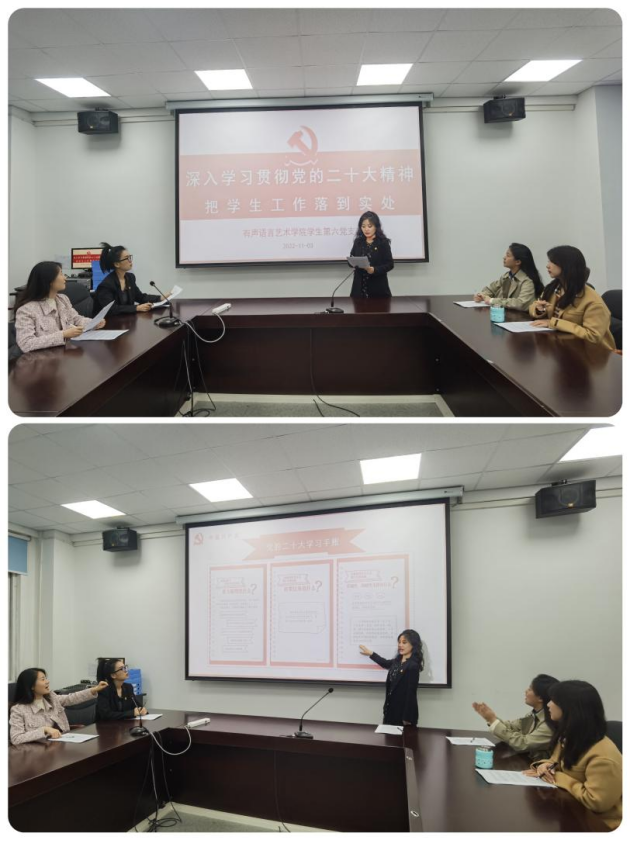 第六支部党员同志在学习交流中,从多个角度深入贯彻学习了二十大会议精神,将会议精神与学生工作紧密结合起来。力争在工作当中做到“坚持正确的问题导向”、“坚持守正创新”,在学生教育方面,秉承科教兴国、人才强国的方针政策,立足于新时代新征程的历史使命,全面贯彻新时代中国特色社会主义思想,踔厉奋发,勇毅前行。