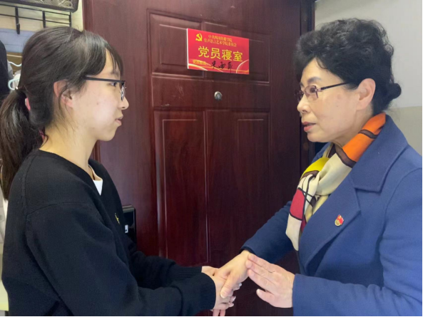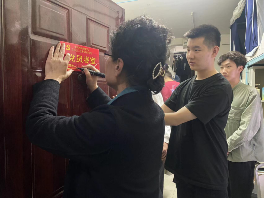 张贴挂牌,党员身份“亮”出来。在挂牌的过程中,芦书记提出,“党员寝室”挂牌不仅仅是身份的亮明,更是责任的展现,每个学生党员都应发挥先锋模范作用,主动接受群众监督,不断提升党性修养、提高责任意识和服务意识,进一步激发学生党员队伍的活力。在结束后,芦书记与每位党员亲切握手,并鼓励其继续努力,不断进步。