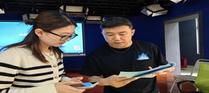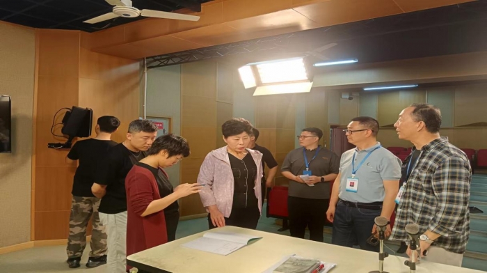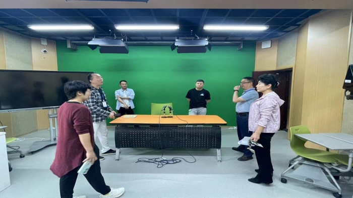 院长马玉坤(左)和副院长、实验中心主任许峰检查新闻直播间