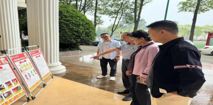 党委书记芦桂萍、院长马玉坤、副院长实验实训中心主任许峰、党委副书记实验实训中心副主任张红权在观看消防知识宣传展板