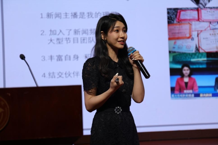 第二个分享的是张如钰,自大学起立志成为新闻主播,她深知基本功的重要性,积极加入新闻频道和大型节目团队播音部,紧紧抓住每一次的实践机会。她说,大学生活是探索兴趣和方向的关键时期,应多观察、多学习、多尝试,在日常生活中要积极表达和经验积累,这是培养沟通能力的关键。她还建议大学生应思考自己的职业目标和能力,利用大学资源深入了解媒体和新闻行业。同时学会合理规划,为未来打下坚实基础。对于职业选择,张如钰还建议同学们广泛关注用人单位信息,主动给招聘单位投递简历。同时,要做实应聘单位“功课”,上网了解不同单位带给同学们不一样的工作领域,在了解的基础上,找到适合自己的职业路径。最后,她提醒学弟学妹们,初入职场可能会遇到挫折,但应保持踏实的工作态度,积极处理人际关系,不断提升自己。她的经历和见解为在场同学提供了有益的职业招聘与个人发展的思考。
