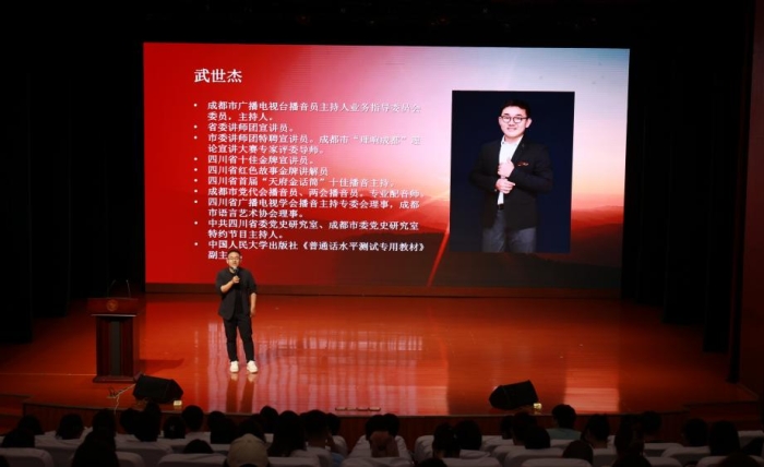 最后一位分享的是武世杰,他从做人与做学问的关系上进行了较为深刻地阐述,他说二者是相辅相成的。做人应真诚、感恩、有责任感,做学问则要勤奋、专注、具备创新精神。学习不仅是知识积累的过程,更是品格塑造的途径。我们进入大学学习,要有感恩之心,要用努力学习的成果回报父母的养育之恩,要让个人不断成长成才,立志成为国家的有用之才,为实现中华民族的伟大复兴贡献力量。对于大学生活,武世杰建议同学们要珍惜这段时光,平衡学习、感情和娱乐,以实现人生的全面发展。分享中,他还特别谈到了普通话、写作能力和共情能力的重要性,这些都是成为优秀主持人的关键素质。在成功的道路上,是需要付出不懈的努力和汗水的。作为年轻人就是要在校努力学习,打好扎实的功底,同时要拓宽视野,了解市场、世界经济、政治和文化,以便在竞争激烈的社会中立足。最后,武世杰总结了自己的学习、成长与工作经历,从做人要有担当,做学问要诚实勤奋,学习要有高技能、高要求,以及要珍惜时光,努力学习,全面发展等方面共勉,为实现个人价值和社会价值而不懈奋斗。