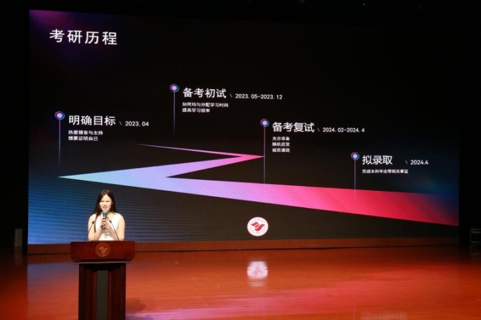 第三位分享的是李艺嘉,她是有声学院2020级学生,今年考上了华东师范大学播音主持专业研究生。她说,很高兴能站在这里与学弟学妹们分享考研的经历。说到考研经历,我的体会就是一要明确目标,制定详细的学习计划;二要按照既定计划完成每天学习任务,有技巧的备考初试。在此,我特别想告诉考研复试的同学,一定要做足“功课”,其一要充分准备,做到“博”,即拥有广泛的知识面和丰富的知识储备,以及“专”,即有经过自己思考后独特的见解;其二要灵活应对,从面试官的视角出发,精心准备并打磨自己;其三复试面试时一定要坦诚,当遇到不了解的内容时要有求索的心态。最后还需劳逸结合,秉持一个坚定的信念。总之,要明确目标,扎实备考,精心应对复试,保持良好状态,不断提升自我。