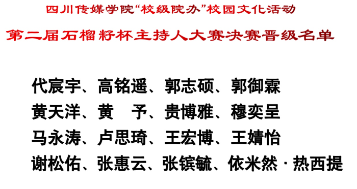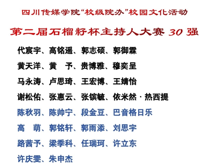 10月14日晚,第二届“石榴籽杯”主持人大赛复赛在四川传媒学院有声语言艺术学院A9教学楼如期举行。本次复赛评审由四川省十佳电视节目主持人刘飞、四川省十佳电视节目主持人袁莉,有声语言艺术学院副院长许峰、播音与主持艺术专业副主任刘旻熹、电视主播主持方向主任付海江、电视主播主持方向教师杨苏担任。经过激烈角逐,大赛评委严格按照评分标准,最终评选出16位选手晋级决赛以及本次大赛30强选手,晋级决赛的同学将于10月18日晚在四川传媒学院大型演播厅争夺桂冠。