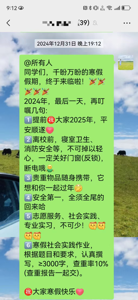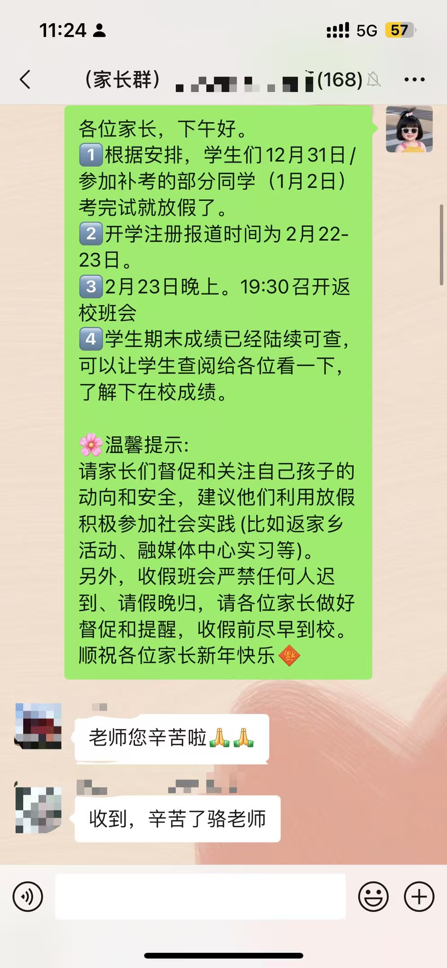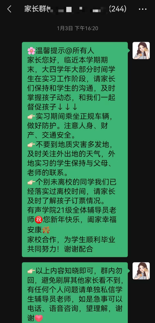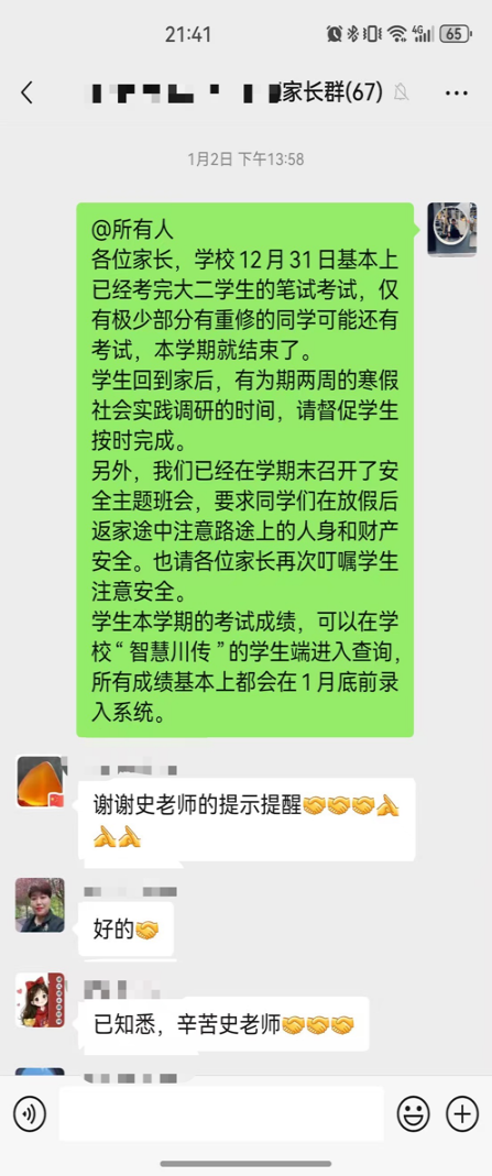 在假期期间,辅导员们将确保通信畅通,随时准备为学生和家长提供必要的协助和指导。我们积极倡导家长和同学们密切关注学校官网、公众号、班级群,以便及时掌握学校的最新动态,从而增强学生对学校的归属感和认同感。