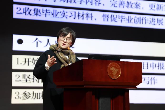 随后,常务副院长姜玮玮教授以“脚踏实地,仰望星空”为题,鼓励老师们在日常忙碌中保持热情和创新精神,她认为“通过精心设计的工作流程和规划,可以有效减少困惑,提升工作效率,使工作变得更为积极和轻松”,并通过分享个人申请、建设应用型示范课程的经历,展示AI制作的数字人分身视频,为老师们解析了课程建设及AI赋能教学的逻辑,具化了前瞻意识在日常教学和个人提升方面的思考与方法,鼓励教师们不断学习、研究、采纳新技术,为增强教学效果、促进教学质量提升积蓄能量。