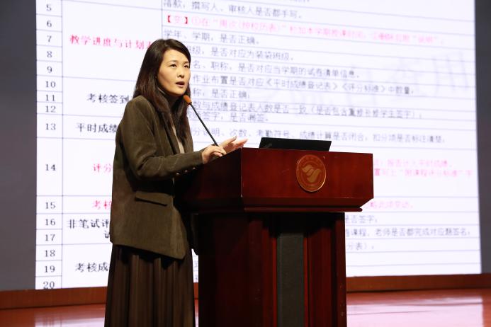 针对本学期期末最重要、最关键的问题,教务办副主任张雨老师逐条、详细的向全体老师讲解期末具体工作的要求,希望全体教师“脚踏实地”做好工作,确保期末各项教学任务的圆满完成。她首先就期末资料归档和试卷袋装袋工作,给全体教师进行逐项培训。她着重强调了资料装袋的细节要求,要求教师们重视教学进度计划、作业布置与评分标准的规范填写,特别强调所有相关资料必须本人手签,成绩登记表的分值必须闭合,电子资料改用U盘留档等。其次,她提醒所有任课教师、辅导员,完成本学期的评学工作、督促学生尽快完成评教工作。最后,她强调了监考教师不能私自更换,对涉及该类行为或有相关需求的教师,她给出了工作建议。张雨老师郑重强调,每位老师都应理解并严格执行教学相关规定,以确保教学工作的规范性,提升教学质量。