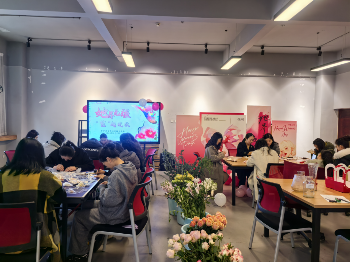 分工会主席安君同志致开幕词,向全体女教师表达了节日的问候与诚挚的祝福,感谢她们在教学、科研和学院建设中所付出的辛勤努力。她简单介绍了本次主题活动项目,其项目丰富多彩,涵盖了插花艺术、车挂手作和传统“非遗”工艺体验等多个艺术形式。