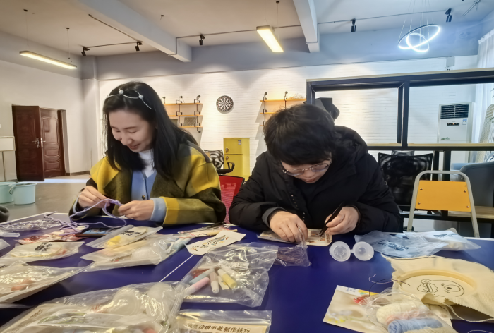 活动现场温馨而热烈,手工体验区被布置得精致典雅,富有艺术气息。在插花艺术区,花艺师耐心指导,女教师们巧手搭配,修剪枝叶,创作出一件件独具匠心的插花作品。在花香与色彩的包围中,凝视着自己亲手制作的插花作品,欣赏着一件件艺术作品,感受着花卉之美,提升了生活情趣。车挂手作区和解压戳戳绣区同样吸引了众多女教师的目光。她们巧手翻飞,用布料、珠子、丝带等材料制作出一个个精美的车挂手作;在戳画的过程中,解压戳戳绣让老师们释放了压力,享受了创作的乐趣。传统工艺的魅力也深深吸引了大家,在掐丝珐琅书签和非遗螺钿工艺体验区,女教师们亲手触摸传统技艺,感受到了非遗文化的深厚底蕴和独特魅力。