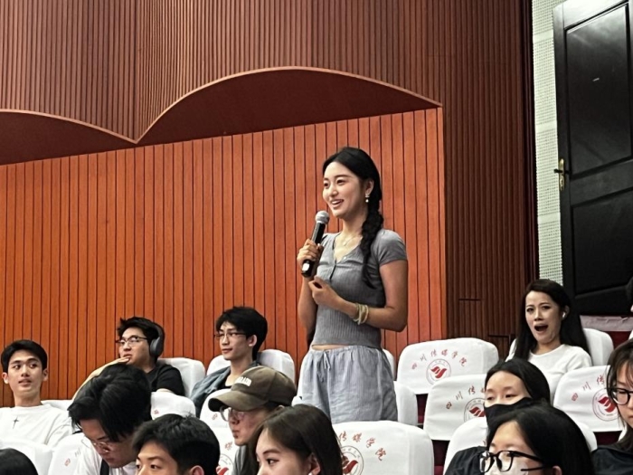 作为2022届的校友,范明远现为成都广播电视台《成都新闻》节目的主持人。他分享了自己从大学时期开始的专业学习经历,以及如何一步步成长为一名电视台的主持人。他说,在校园学习期间,他特别注重基础理论知识的学习,这为他日后的职业生涯打下了坚实的基础。发声技巧的系统训练,这让他在播报新闻时能够做到字正腔圆,发音清晰准确。表达能力的打磨,练习,使自己能够更加自信和流畅地进行语言表达。听力训练的练习,帮助他更好地理解新闻内容,并准确地传达给观众。实践与模拟的训练也非常重要。正是这些学习,练就了扎实的功底,让他在面对镜头时能够保持沉稳大气的主持风格,给观众留下了深刻的印象。范明远学长鼓励大家要怀揣热爱播音事业的初心,用声音传递社会的真善美。
