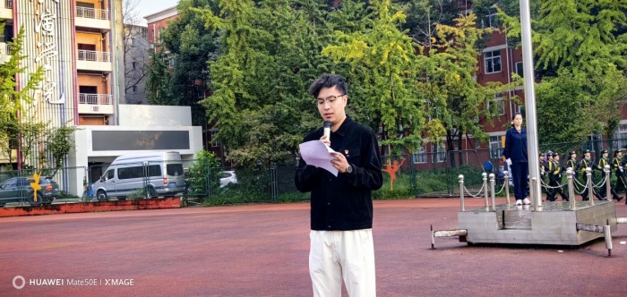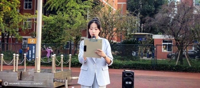 25级学生代表毛楚婷在发言中说,当朝阳冲破晨雾,五星红旗随国歌冉冉升起,那抹鲜红映照着大家的脸庞,也唤起了对80多年前那段峥嵘岁月的深刻记忆。此刻站在国旗下,大家既向祖国致敬,也聆听着先烈的嘱托——他们用热血铸就的抗战精神,并非陈列的历史,而是指引大家笃行向前的“爱国、敬业”坐标。