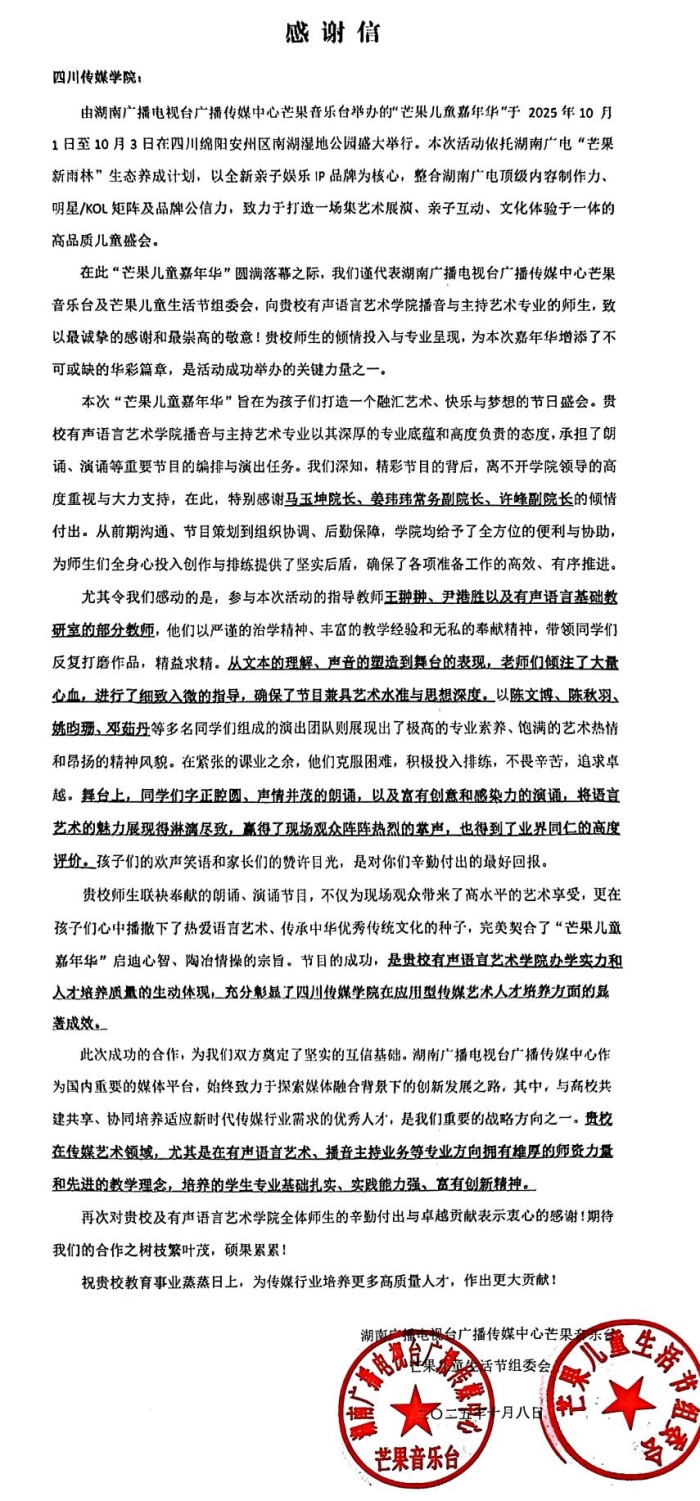 活动结束后,主办方湖南广播电视台广播传媒中心芒果音乐台及芒果儿童生活节组委会特地致信我院,对师生们的专业表现给予高度评价。信中特别指出:“贵校在传媒艺术领域,尤其是在有声语言艺术、播音主持业务等专业方向拥有雄厚的师资力量和先进的教学理念,培养的学生专业基础扎实、实践能力强,富有创新精神。”这一评价不仅是对本次演出活动的肯定,更是对我院人才培养质量的认可。