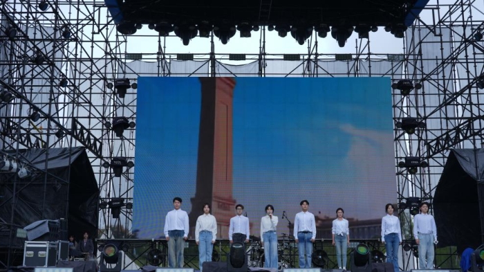 (2025级播音专业学生赵亚鹏、黄渝茜、姜祉祐(影配)、梅艺凡、李龙、韩欣桐、冯诗琪、罗昊(左起))