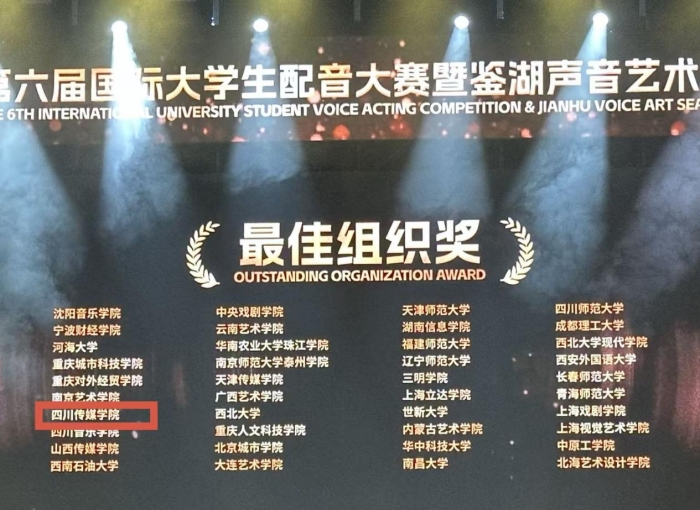 近日,2025第六届国际大学生配音大赛暨鉴湖声音艺术季在浙江绍兴柯桥区圆满收官。我院学子凭借过硬的专业素养与灵动的声音表现力,在全球高校竞争中崭露头角,一举斩获多个赛道重要奖项,学校同步获评“最佳组织奖”,指导教师团队亦收获“优秀指导教师奖”,尽显川传在声音艺术人才培养领域的强劲实力。