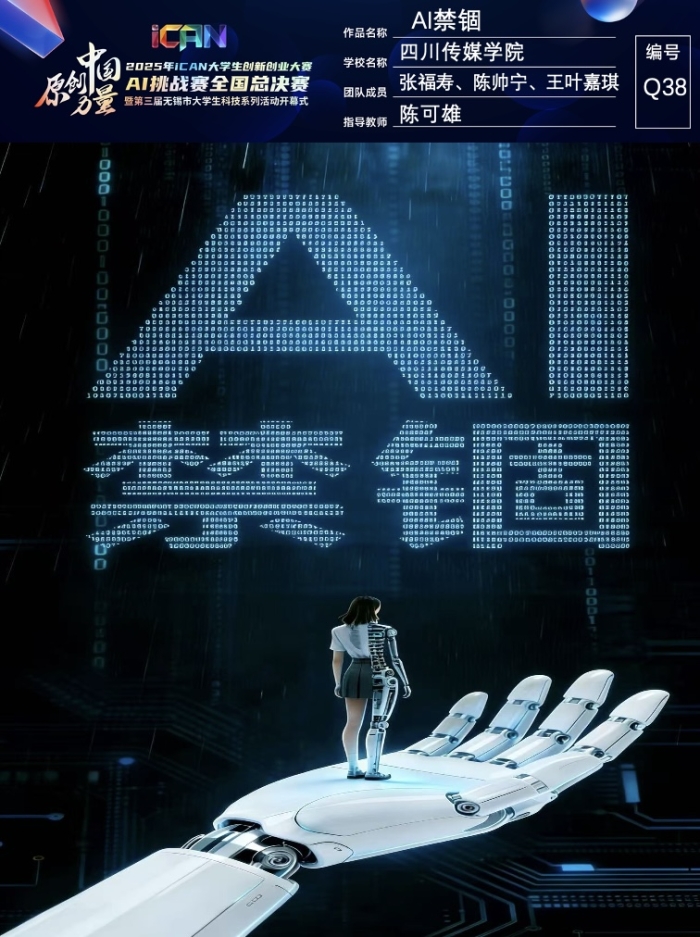 在“万物皆媒,人机共生”的时代浪潮下,语言不仅是沟通的桥梁,更是破局的利刃。近日,被誉为“青年创新盛会”的2025年iCAN大学生创新创业大赛AI挑战赛全国总决赛圆满收官。我院张福寿、陈帅宁、王叶嘉琪三位同学组成的战队,在陈可雄老师的专业指导下,凭借作品《AI禁锢》历经层层严苛选拔,从全国众多高校中强势突围,一举斩获2025 iCAN大学生创新创业大赛AI挑战赛全国总决赛——三等奖。这不仅是一份印刻着大赛专属标识的荣誉证书,更是有声语言艺术学院学子在激烈的角逐中,拼尽全力换来的硕果。